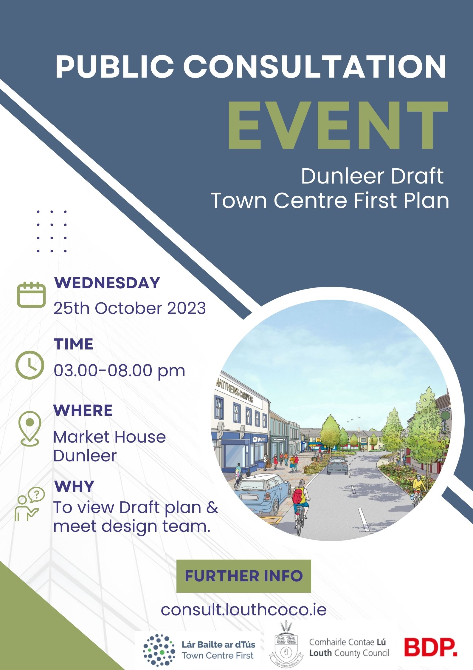 A drop in consultation event where the public can meet with the design team and view the draft plan will take place on Wednesday 25th October from 3.00pm to 8.00pmat the Market House, Main Street, Dunleer.