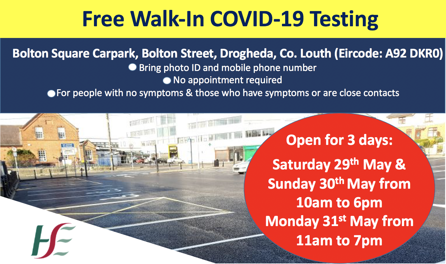 Extension to free walk-in COVID-19 test centre in Drogheda from Saturday May 29th until Monday May 31st.