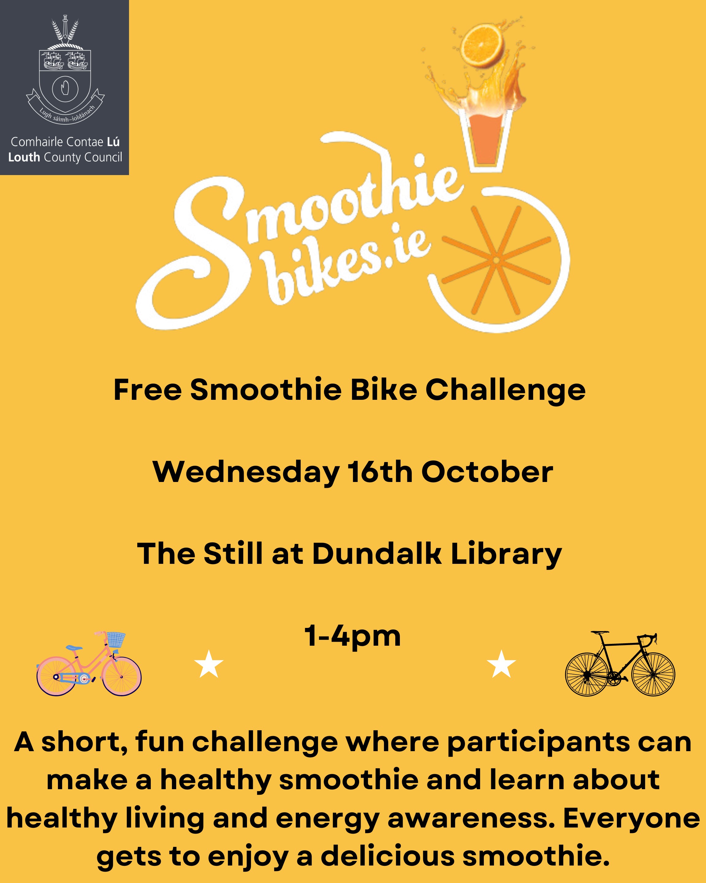 Cycling shoes at the ready for a ‘Smoothie Bike Challenge’ on Wednesday 16th October at ‘The Still’ on the grounds of Dundalk Library from 1pm to 4pm. A short, fun challenge, it will encourage everyone taking part to make and enjoy a healthy smoothie while learning about healthy living and energy awareness. The day will also feature a free repair and bike maintenance workshop, with tips and guidance on how to fix and keep bicycles in good running order, encouraging cycling as a sustainable and climate friendly mode of travel.