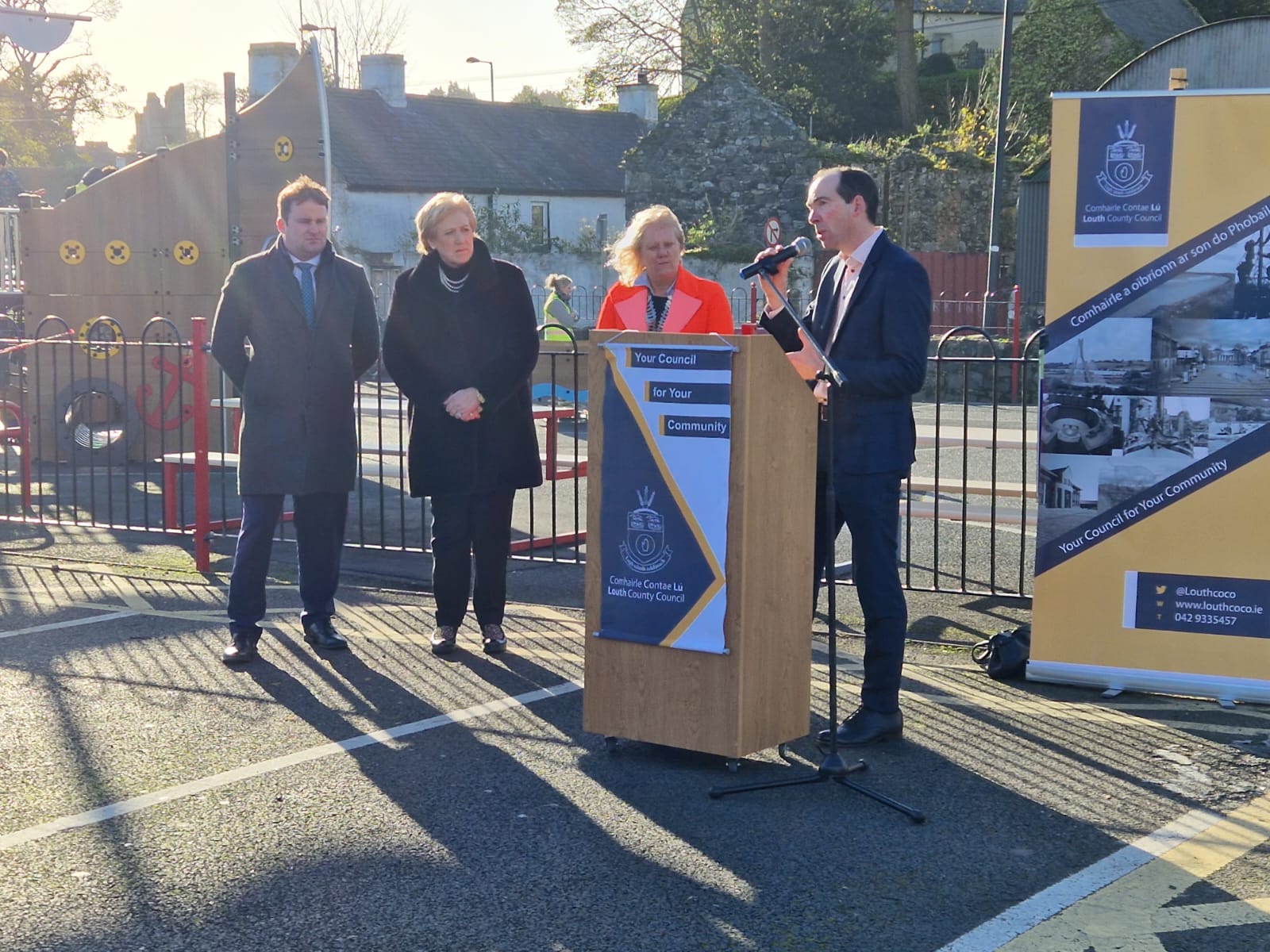 Louth County Council unveiled the newly refurbished Carlingford playground, which was launched by Minister for Rural and Community Development, Heather Humphreys T.D at a ribbon cutting ceremony in the village on November 15th 2023.The new look park, which has been fitted with a range of modern play equipment, was one of a number of initiatives in the village highlighted by the Minister during her visit.