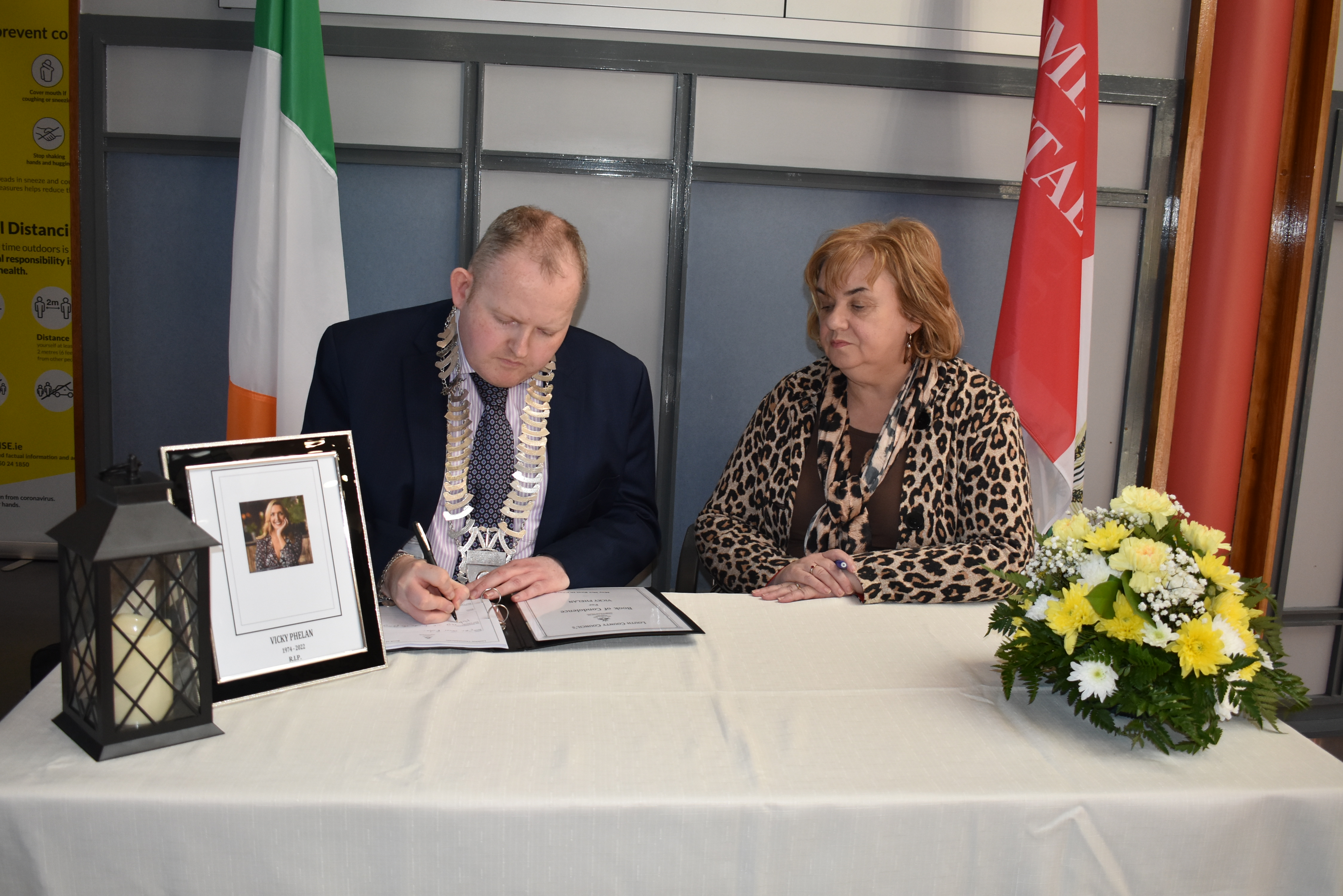 A Book of Condolence in honour of Vicky Phelan has opened in County Hall Dundalk, by the signing of same by the Cathaoirleach of Louth County Council, Councillor Conor Keelan in the presence of the Chief Executive Joan Martin.