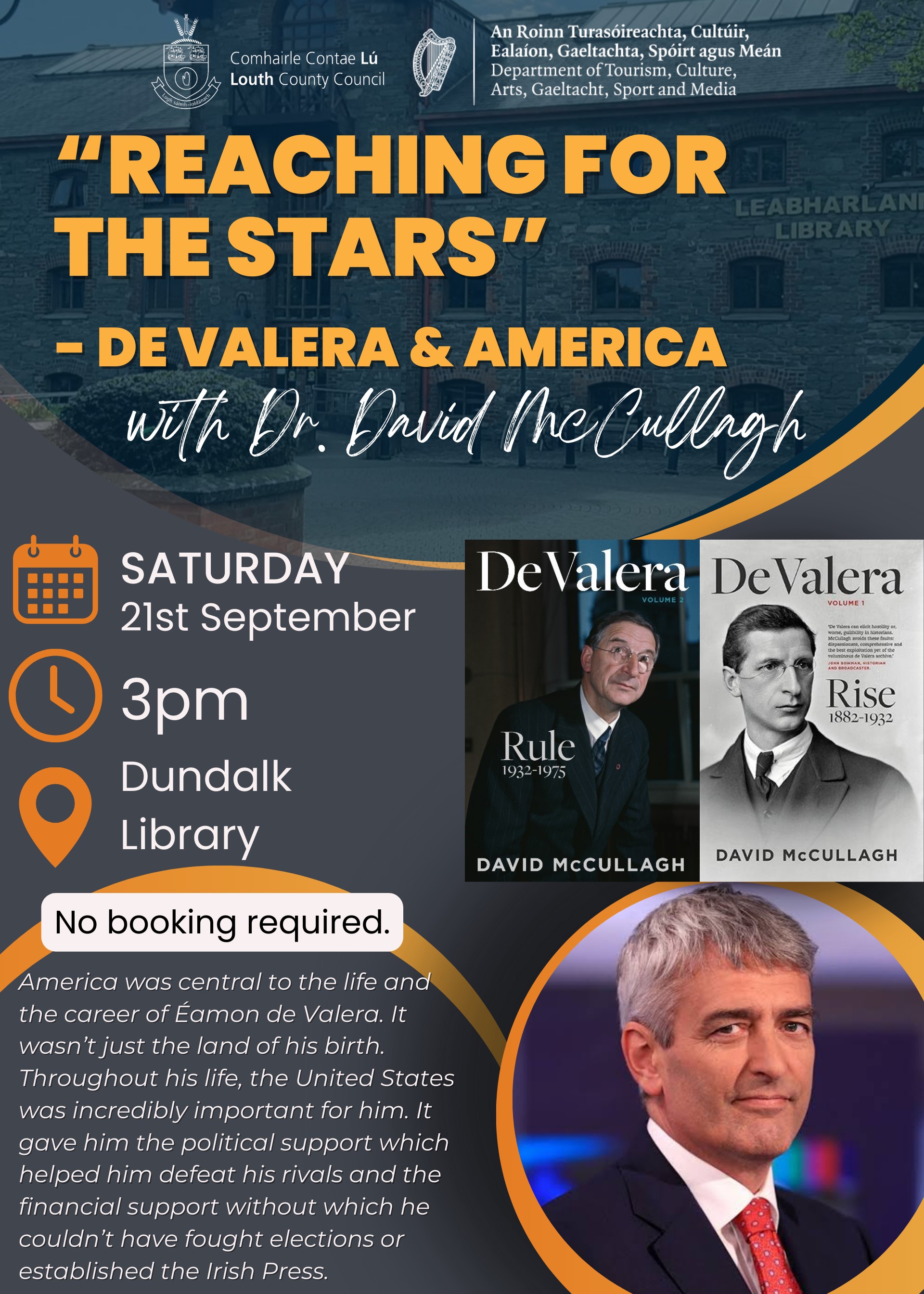 “Reaching for the stars” - de Valera and America-Dr. David McCullagh - Dundalk Library, Saturday 21st September at 3pm.